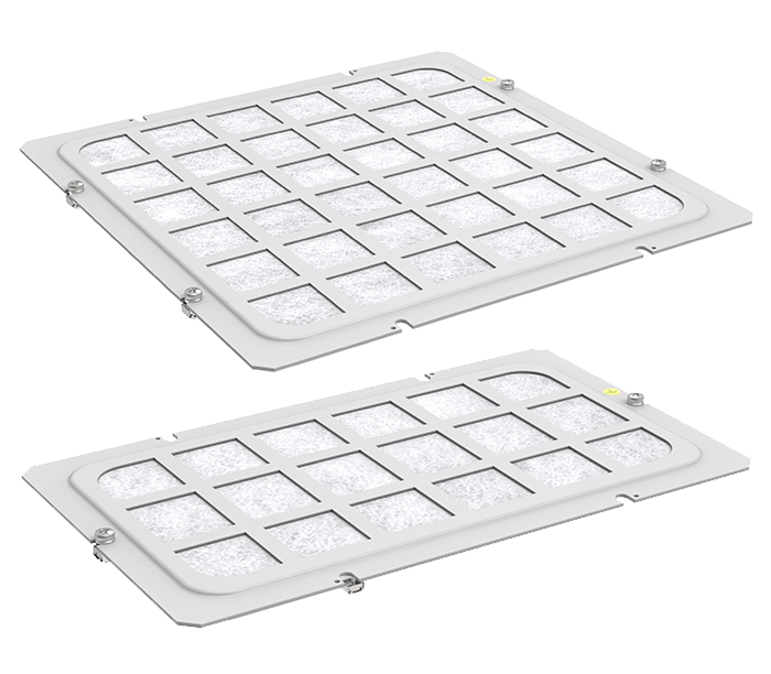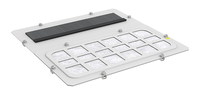 Komplet 2 zaślepek przesuwnych (nr 4 i 5 lub 6 i 7) z pianką uszczelniającą lub szczotką. Przeznaczony do 1 otworu w płycie dolnej szafy SZE3 (uwaga: szafy o szerokości 1000 i 1200 mm mają w płycie dolnej 2 otwory).